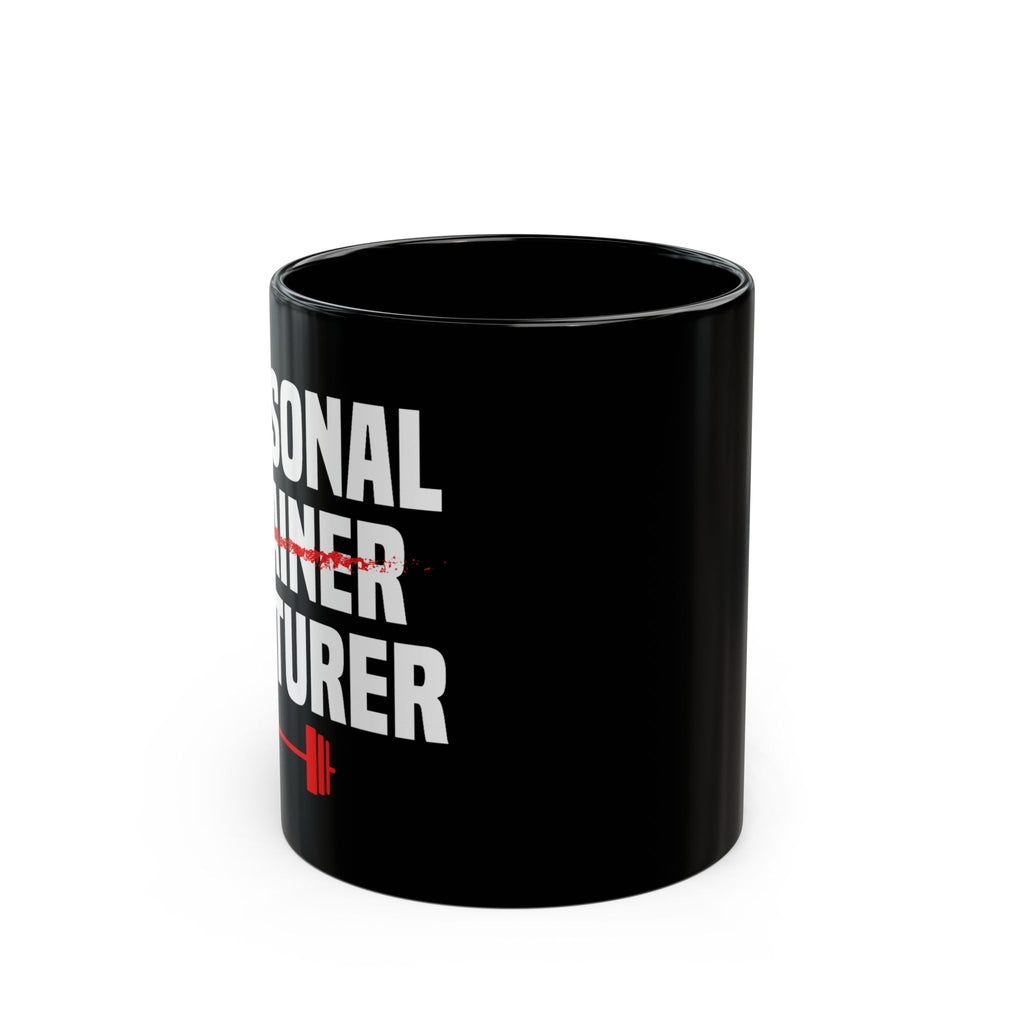 Why You'll Love This Funny Personal Trainer Mug: Hilarious Personal Trainer crossed out Torturer barbell graphic that every coach and gym rat will love. Perfect funny gift for personal trainers, gym coaches, clients who survived burpees, and fitness humor fans. Great for the gym office, home counter, video calls, and anywhere you want to deliver a laugh. Makes a fun thoughtful gift for holidays, birthdays, and PR celebrations. The black backdrop lets the red and white palette pop for maximum impact.